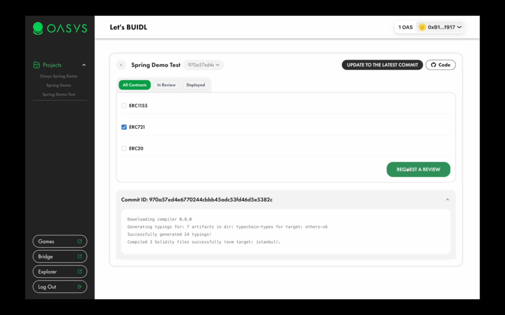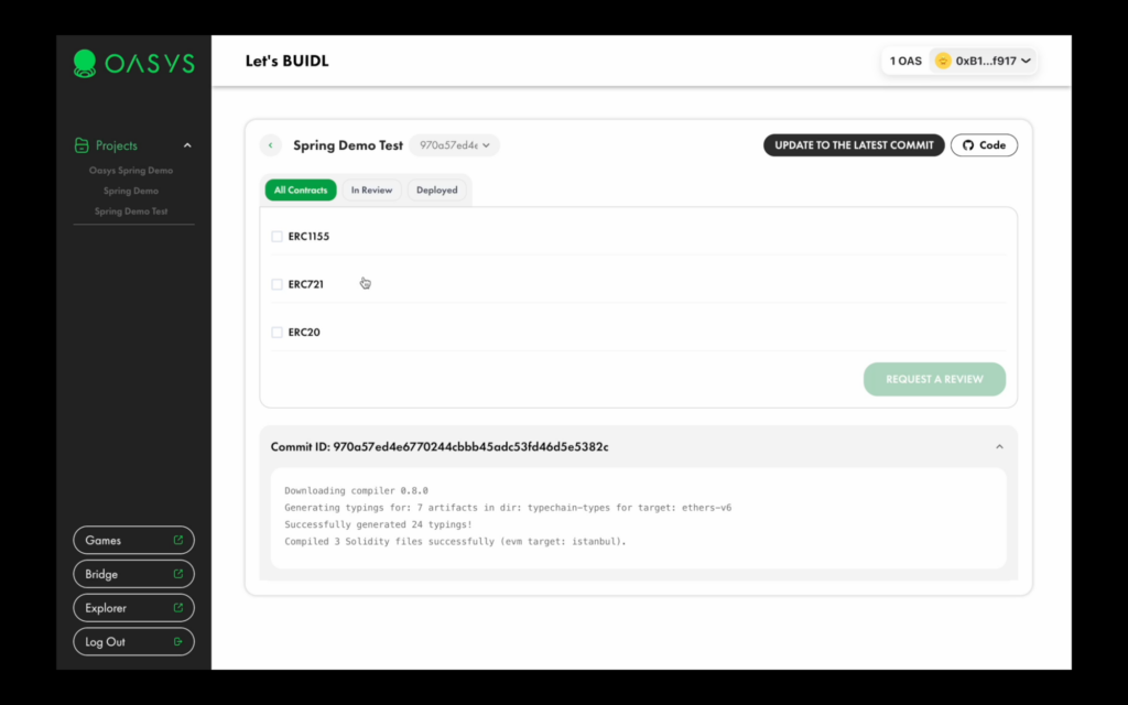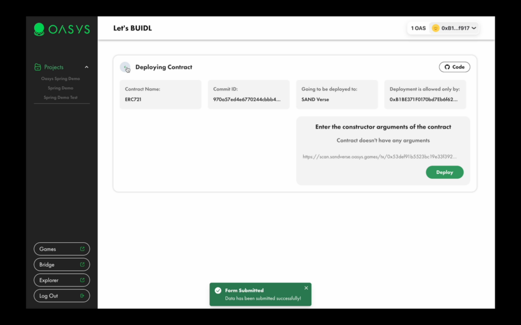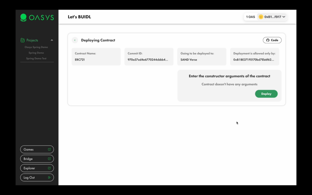Oasys Spring* is a tool for beginners and developers to deploy their first of many dApps and games in a couple of clicks directly from GitHub Repositories via AI scanning on Oasys. Developed in collaboration with Bunzz, Asia’s largest smart contract development platform, Oasys Spring simplifies the smart contract deployment process on Verses. This GUI tool will help you with building and deploying on the Oasys blockchain without writing a single line of code.