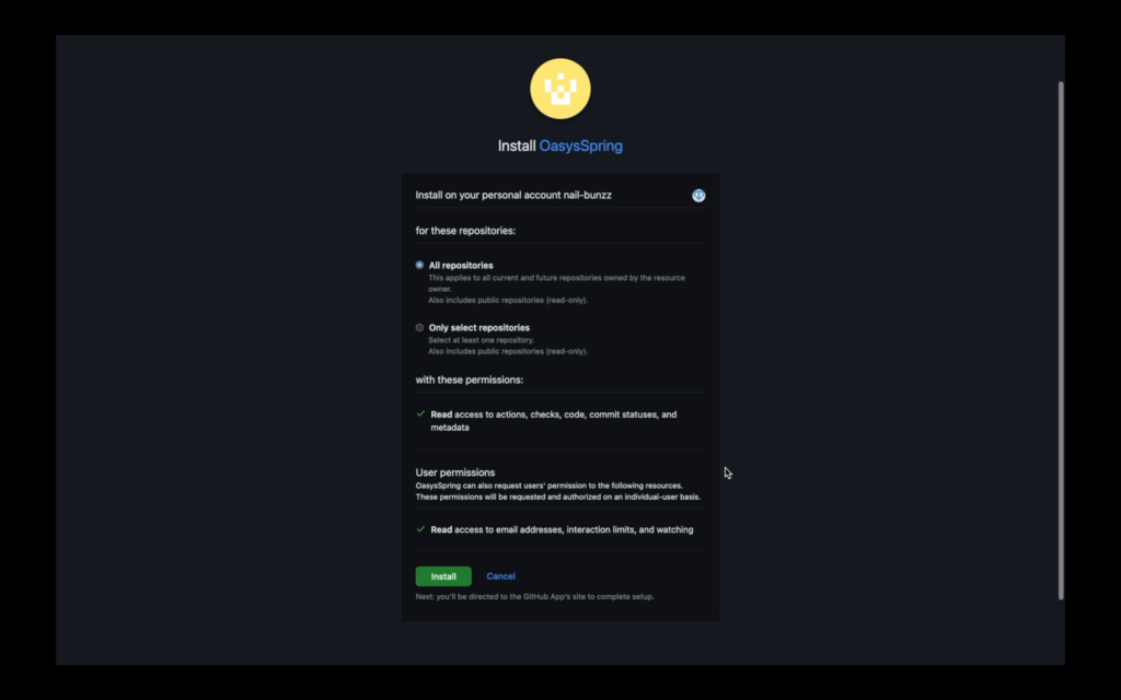 Click on CONTINUE WITH GITHUB button to install the OasysSpring application on your GitHub repositories. As an example you can fork the repository used in the video. testing-erc20